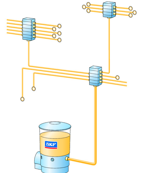 Progressive systems are similar, except the single line goes to a series of valve blocks instead of a parallel line of injectors. Each valve block meters lubricant to various points within a machine; one block may have up to 12 points to which it provides lubricant, and the next block or zone will lubricate another 12 points, and so on. “The main difference is if you have one bearing that blocks, it literally stops the entire system because the grease is progressing through the system in a series,” Laucis says. “If you block one bearing it will actually have a hydraulic lock on every piston in that block in the system, then the whole system shuts down.”